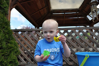Carter found a few eggs, but really gravitated to the Power Wheels Jeep. He opened the hood and said "There's dangerous in here Mommy, don't touch" (so glad he has started calling me Mommy again!). All he wanted to do was sit in the jeep and "work on it". Fine with me. This is about him, not about how much candy he can amass.